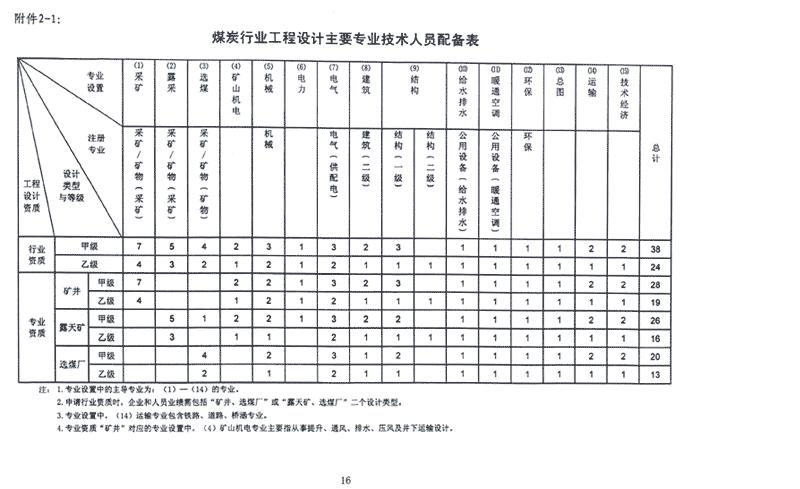 煤炭行业工程设计主要人员配备表